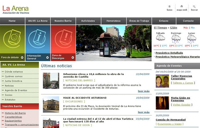 La A.A. V.V. de La Arena quería una página totalmente gestionable, que les permitiera subir información referente a la misma mediante una Intranet. Todo el site es autogestionable, permitiendo subir noticias, actividades, ficheros...Web corporativa de la agencia Sweet Comunicación