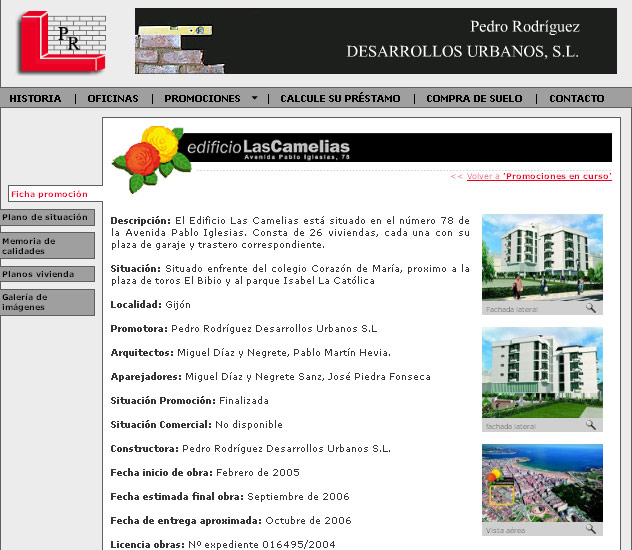 Pedro Rodríguez necesitaba una página en la que publicitar las promociones que construye en la provincia de Asturias. Para ello se creó un Gestor de Contenidos desde donde se pueden añadir nuevas promociones, incluyendo datos de la promoción, memoria de calidades, planos, fotos,...